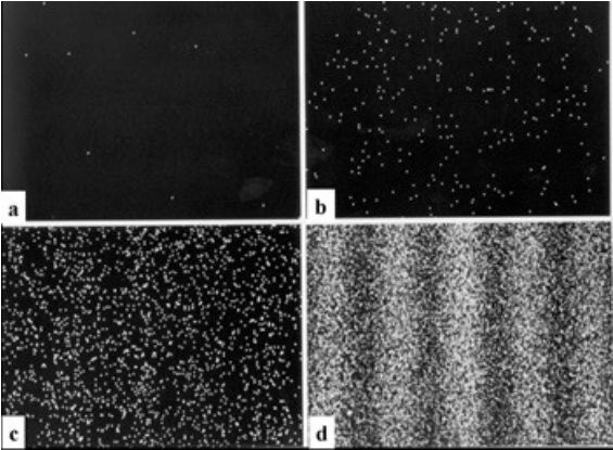 图2:用电子作双缝实验,结果得到了如通常的波一般的干涉图样。从第一张图到第四张图,电子越来越多,干涉图样也越来越清晰。但值得注意,虽然图中每一个点表示有一个电子抵达探测屏,但点的离散状却并不意味着电子的“粒子性”。此实验由外村彰(Akira Tonomura)团队于1988年开展。