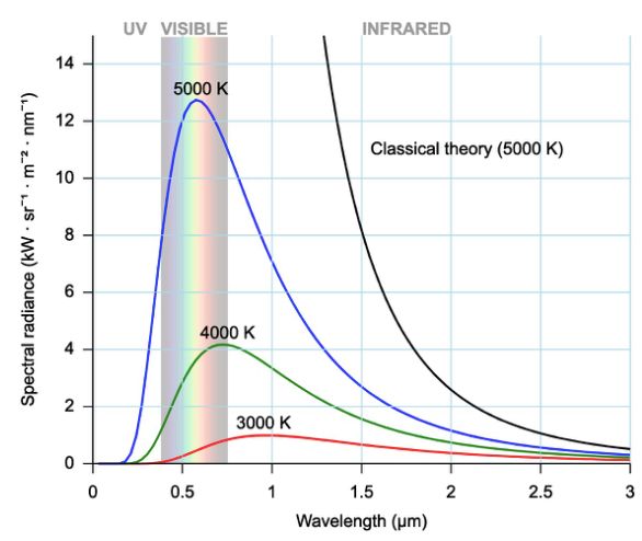 图1:黑体辐射的频谱。 普朗克公式与实验结果完全一致。