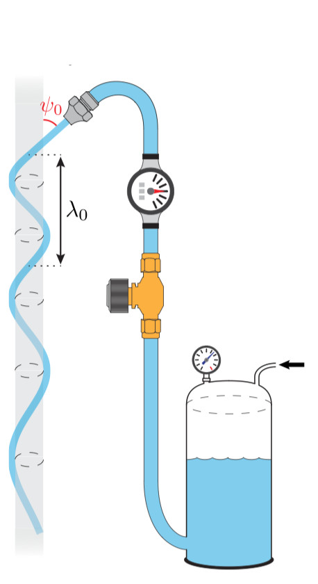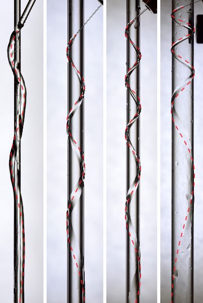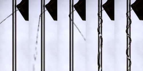 之后,研究人员还用不同直径的玻璃管重复了这一实验,以及用由铁氟龙(Teflon,聚四氟乙烯,一种稳定的不粘材料)制成的圆柱体进行重复实验。他们发现,无论在何种情况下,都能观察到相同的行为:一旦射流完全粘在固体上,就会形成一个液体螺旋,它的具体形状取决于射流的初始速度和几何。