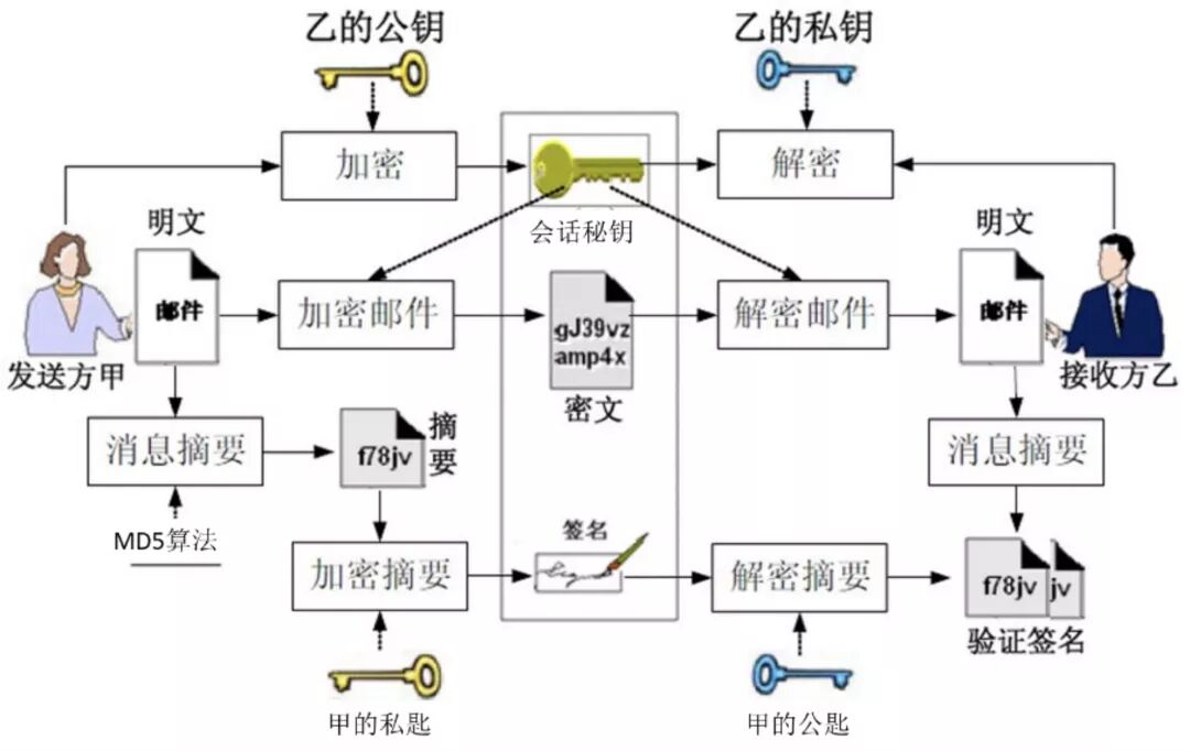互联网上身份认证怎么做呢?最常用的办法是数字签名,这是公钥密码系统中非常重要的一环。数字签名不仅能进行身份认证,还可以对所传递的信息做校验,保证信息的完整性和不可篡改性。具体的做法是,发信方用一个哈希函数(比如MD5)对信息内容生成一个摘要,然后用私钥加密这个摘要,与加密后的信息(用对方公钥)一同传给对方。对方用公钥解开摘要,用自己的私钥解开信息,并用相同的哈希函数生成信息摘要,然后与发送过来的摘要做对比,相同则说明信息没被篡改过且是完整的。由于公钥私钥一定是成对的,因此上述过程就完成了身份验证、信息真实性和完整性验证。