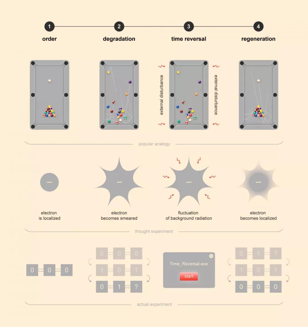 下图所示:在量子计算机上的实际实验的四个阶段反映了思想实验的各个阶段,涵盖了太空中的电子以及台球的想象类比。这三个系统都是从起初的有序向无序演化,然后一个完全定时的外部干扰逆转了这一过程。