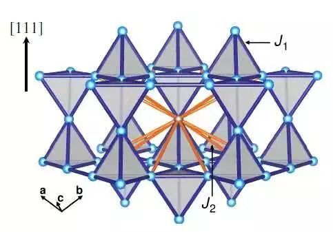该模型为立方晶体结构(焦绿石晶格),不仅包括最近邻居之间的磁相互作用,还包括与下一个最近邻居之间的磁相互作用(见图)。图片:HZB
