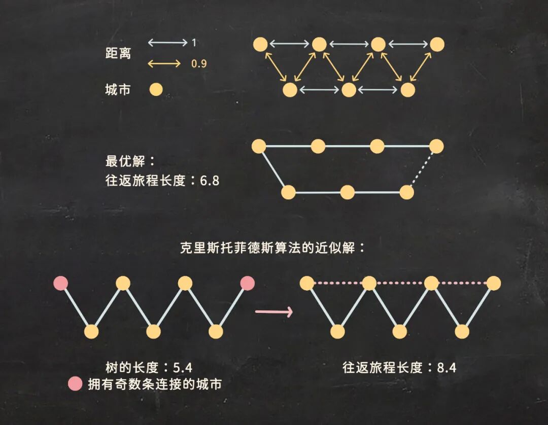 这是一个简单的TSP例子,在这个例子中,最优解并不复杂。而克里斯托菲德斯算法会先找到连接所有城市的最短树,然后再将它转换成完整的往返旅程。| 图片设计:雯雯子;素材参考:[1]