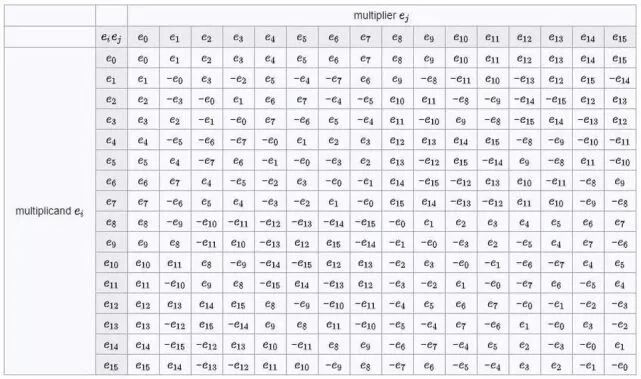 (图示)七元数的乘法规则,即扩展8元素八元数的16元素代数,根据非交换、非结合的数学规则,这不会造成问题。但是对于没有赋范的除法代数,这就是为什么科学家们在寻找物理应用时不进一步扩展八元数的原因。