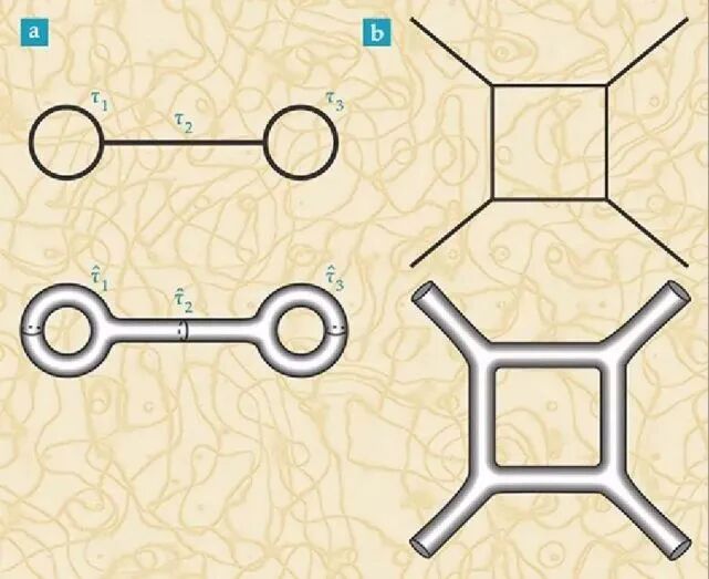 (图示)费曼图(上)基于点粒子及其相互作用,将它们转换成弦理论的类似物(下),可以得到具有非平直曲率的曲面。在弦理论中,所有粒子只不过是一种潜在、更基本结构的不同振动模式:弦。但是,与弦理论有着紧密联系的八元数,真的在宇宙中扮演着重要角色吗?或者这只是数学问题?