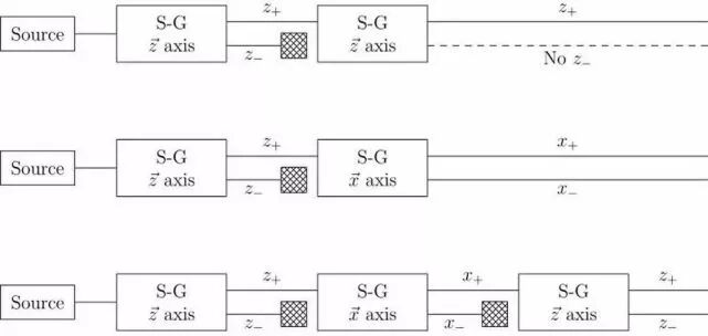 (图示)多个连续的斯特恩-格拉赫(Stern-Gerlach)实验,根据量子粒子的自旋沿着一个轴分裂量子粒子,将在垂直于新测量方向上造成进一步的磁分裂,但不会在同一方向上产生额外的分裂。