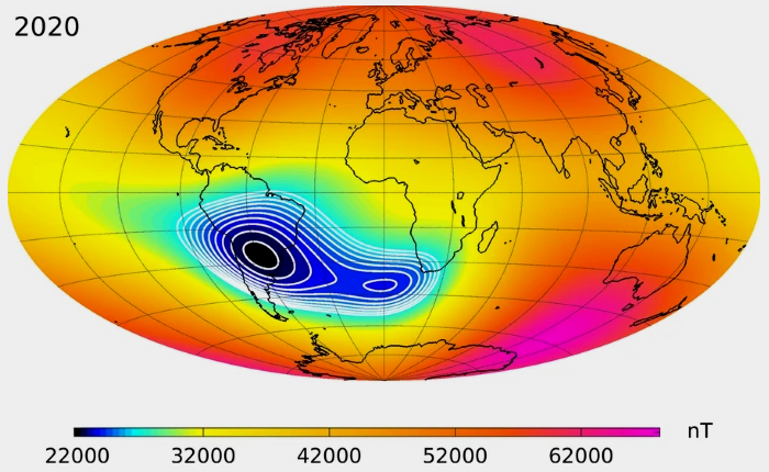 还有一些现象也引起了人们的注意。在南美洲海岸附近的南大西洋,一片磁场异常微弱的区域日益扩大。这是全球地磁最弱的一片区域,也被称为南大西洋异常区(SAA)。由于暴露在来自太阳的高电荷粒子下,卫星曾数次在此发生故障。NASA曾有报道显示,哈勃空间望远镜在途径SAA时也不会进行观测。