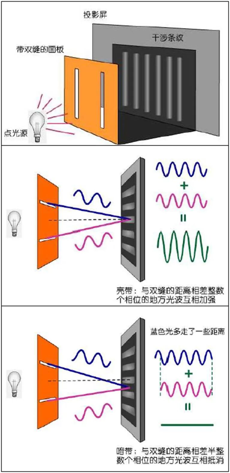 反之,波的叠加理论却能够轻易预言明暗条纹出现的原因及其位置!