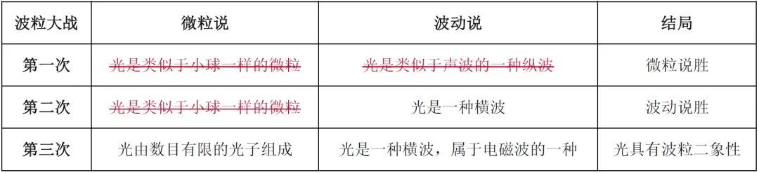 下面的表格整理了三次波粒大战的内容与结局(其中的红色文字表明该观点是错误的)。