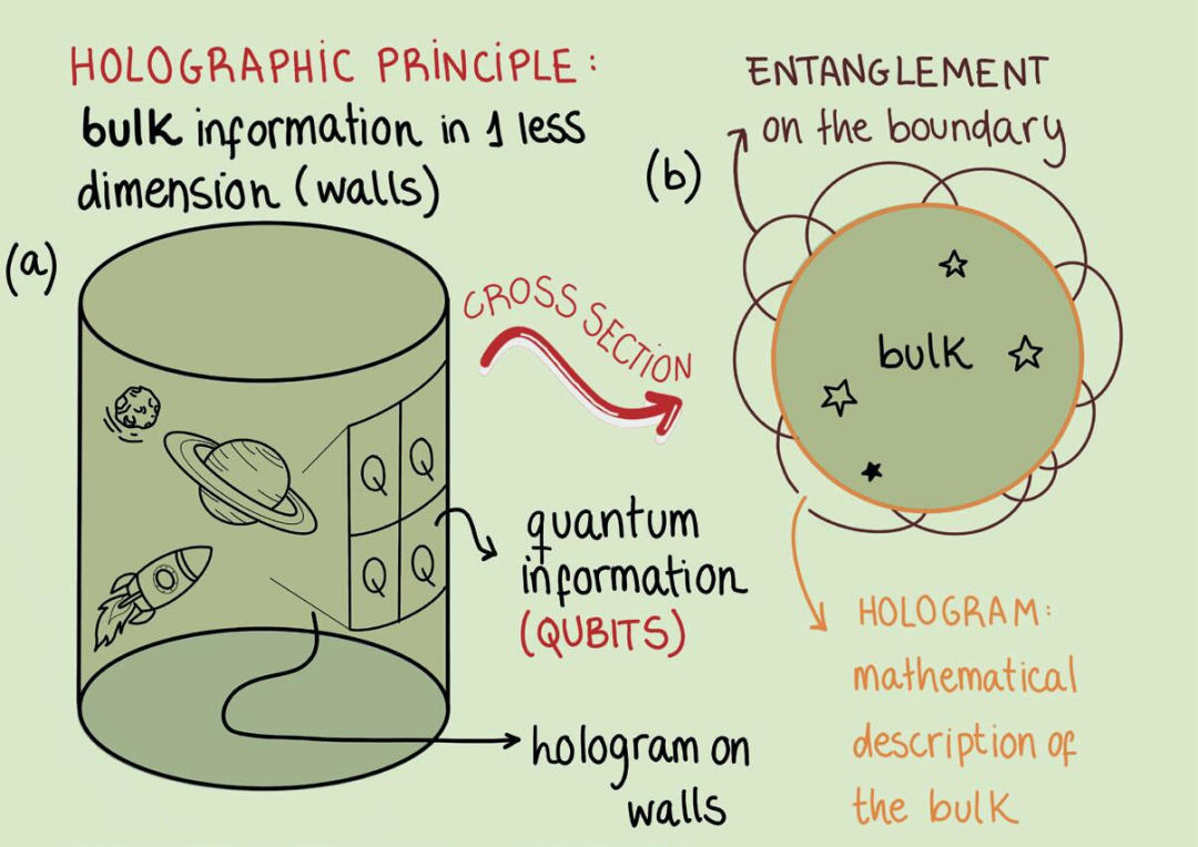 量子比特是具有两种(或更多)可能状态的量子系统。经典比特可以取值0或1,但量子比特所具有的量子特性使其可以处于叠加态。如果把这些量子比特纠缠在一起,知道其中一个的状态就意味着知道另一个的状态。这个概念可以很容易地扩展到任意数量的量子比特的集合。将每个量子比特与其邻近的量子比特纠缠会产生一个二维网络,进一步纠缠这样的二维网格就会产生三维几何结构。这就联系了前面’t Hooft的想法,因为发生纠缠的量子比特在它们存在的维度之外又“创造”了一个新的维度,这也就解释了全息原理中引入的体空间及其边界的存在。但是,考虑全息面上两个遥远的子区域纠缠在一起形成它们之间的时空体,信息从一个子区域瞬间传播到另一个子区域,这不就意味着超光速吗?事实上,光速仍然是物理的极限。我们可以这样来理解:纠缠并不发生在时空中,它创造了时空。就像岩石或橙子是由原子组成的,但它们并不表现出原子的物理特性。所以构成空间的元素不需要是空间的,但如果以正确的方式来组合,就会具有空间特性。