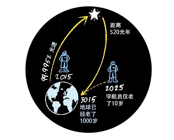 对于高速物体长距离运动而言,时间穿梭的效应更加明显。如果克里卡列夫现在离开地球,并以光速的99.995%在猎户座的恒星参宿四(Betelgeuse;距离地球520光年)与地球之间做一趟来回飞行。当他回到地球时,仅仅老了10岁,但是非常遗憾的是,他认识的所有人都早已去世,因为地球上已经过了1 000年。戈特说,“我们已经知道,我们可以做到向未来飞越,这仅仅是钱和工程技术的问题。”