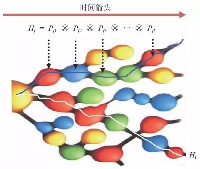 来定义量子世界包含时间演化和测量的历史。Pj代表在t=j 时到某本征态上的投影。不同的历史,相当于多世界理论中世界分裂的不同分支。显然,任意给定一个历史的集合,不同的历史之间有干涉效应,每一个历史相互不“独立”,不能定义经典几率。为了衍生出经典概率,格里菲斯对描述历史的投影算符乘积给出了自洽条件Tr(HjρHl)= 0( j ≠ l) ,其中ρ 代表系统的密度矩阵。满足这个条件的历史集合中的历史被称为自洽的历史。对每一组自洽的历史,可以赋予一个经典概率描述: Pr( j) = Tr(HjρHj) 。如果把每一个历史当成多世界理论中世界波函数时间域上的一个分支,自洽历史处理可以视为多世界理论的某种推广发展。在这个意义下,多世界可以看成是我们唯一宇宙“多种选择的历史”。按美国加州理工学院的哈特尔和盖尔曼的观点,虽然世界只有一个,但却可以经历很多个可能历史组。