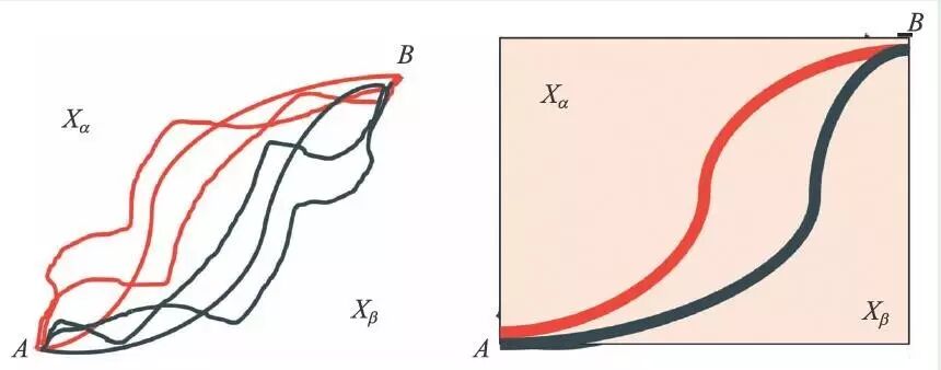 我们还可以借助“薛定谔猫”来展示什么是退相干历史诠释。假设“猫”作为一个宏观物体是由大量有空间自由度的粒子组成,每一个粒子有自己空间运动的轨迹,满足各自的薛定谔方程,它们每一个的演化构成了“猫”的精粒化的历史,代表了“猫”的动力学所有的微观态细节。如果用路径积分描述这些“历史”,则不同路径之间是干涉的。由于这些粒子间存在相互作用,则“精粒化历史”对应的“轨道”与自由粒子的轨道不是一一对应的。现在我们不关心组成“猫”的每一个粒子的运动细节,只关心它的质心或者其他宏观自由度。某个特定宏观自由度的运动是微观自由度某种集体合作的结果,可以视为“猫”的所有微观演化过程的粗粒化。由于相对运动的影响,它的相干叠加态的时间演化会导致相位差的不确定性,从而相干性消逝。如图8所示,从路径积分的观点看,粗粒化后两条不同路径是不相干的,相干函数变为零,从而导致所谓退相干的历史。