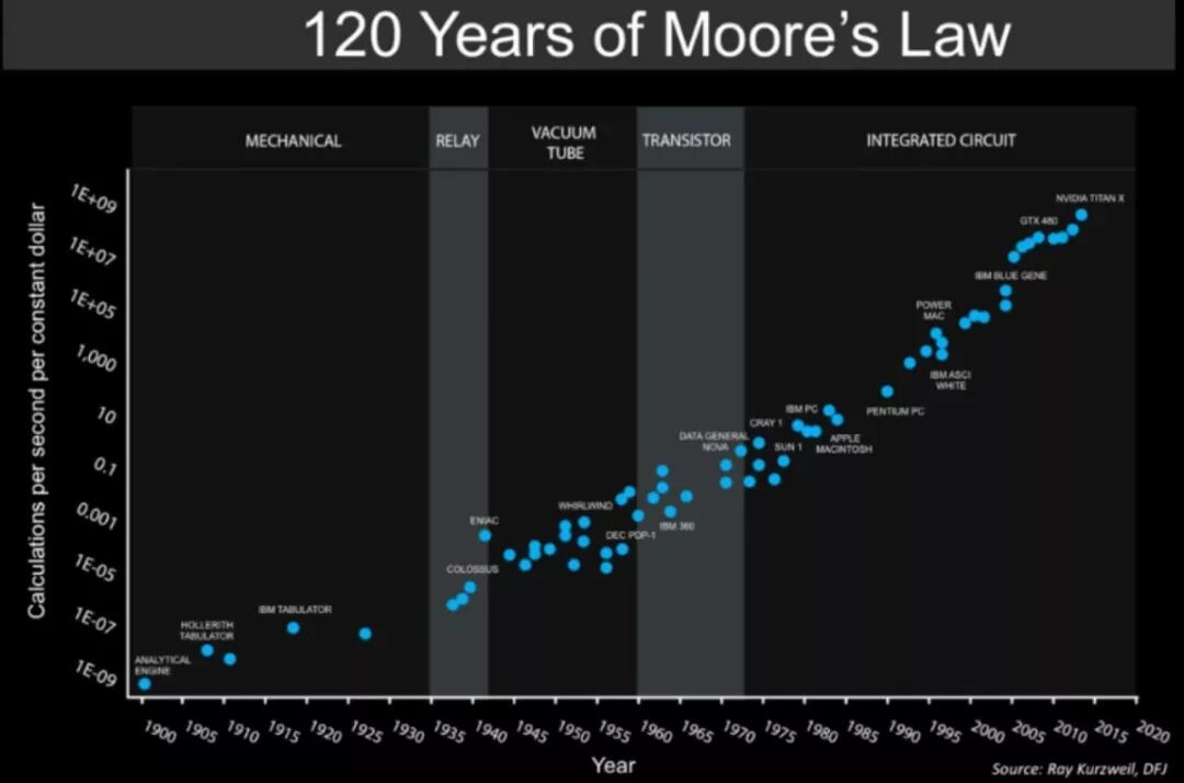 摩尔定律告诉我们,集成电路特征尺寸随时间是按照指数规律缩小的。可以说,它是集成电路发展的风向标。如果硅基芯片走到“穷途末路”,就意味着芯片上所能容纳的元器件数目达到了极限,那么芯片性能也就无法继续提升了。通俗一点,计算机更新换代的时代就结束了。这听起来非常耸人听闻,但却的确是一个切实而严峻的问题。