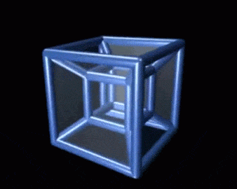 就像平行的太阳光照射物体后在二维平面上投下阴影一样,我们可以假想一个四维太阳,它将四维物体的阴影投射到我们的三维世界中。这很难在头脑中想象出具体的图像,却很容易通过计算机的编程实现。超立方体投影到三维空间后看起来是这个样子: