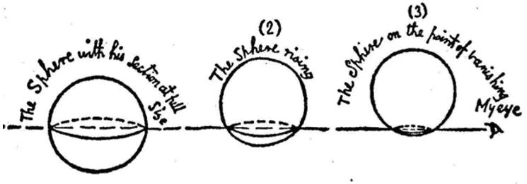○ 埃德温·艾勃特的《平面国》:(1)全尺寸的球体截面;(2)球体上升,截面减小;(3)球体上升到截面变成一个点。| 图片来源:E.A Abbott