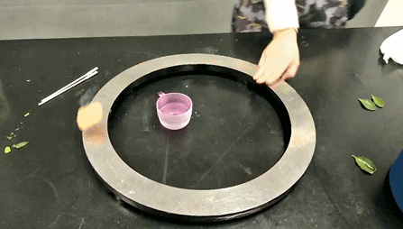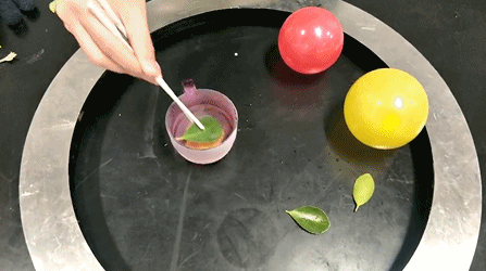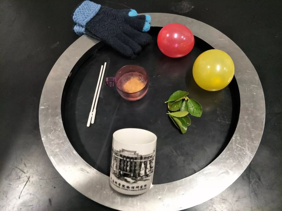 所标杯、防护手套、塑料筷、圆形磁铁、液氮、超导体( 钇钡铜氧)气球、新鲜树叶