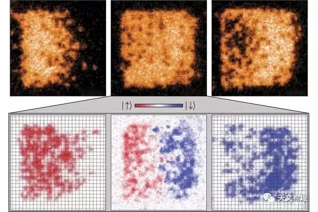 原子就像小磁铁,所以施加磁力把它们推到左边(左上角)。由于这些原子相互排斥,如果没有空的位置(中间上部),它们就不能移动。但是原子“磁针”仍然可以自由移动,较强的磁体(红色)扩散到图像的左边,较弱的磁体(蓝色)必须留出空间并移动到右边(底部一行)。这种所谓的自旋输运是在冷原子量子仿真器中一个原子一个原子地解决。图片: Massachusetts Institute of Technology