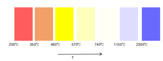 首先,从酒精灯火焰的内外焰温度和焰色不同我们发现火焰颜色其实是与温度有关的,他们之间的关系是怎样的呢?这就是黑体辐射——任何物体都具有不断辐射、吸收和反射电磁波的性质,辐射出电磁波的波长具有一定的谱分布,这个分布只与物质本身和温度有关,如果忽略物质本身的影响,这就是理想的黑体辐射模型。在黑体辐射模型中,随着温度的升高,黑体呈现从红-橙红-黄-黄白-白-蓝白的渐变过程,温度越高,红色成分越少,蓝色成分越多。下图分别展示了黑体辐射和实际生活中颜色与温度的对应关系: