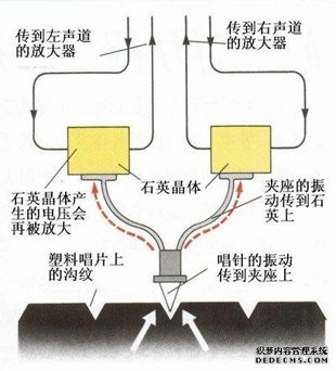 唱片机,又名留声机。是一种放音装置,其声音储存在以声学方法在唱片圆盘平面上刻出的弧形刻槽内,唱片置于转台上,在唱针之下旋转,当唱针沿着沟槽移动, 针尖随沟槽波动而轻微地振动。这个振动通过机械装置传送一个膜而将其放大并散发在空气中。当唱盘转动速度与录音时一样, 声音就被准确地恢复出来。如图所示: