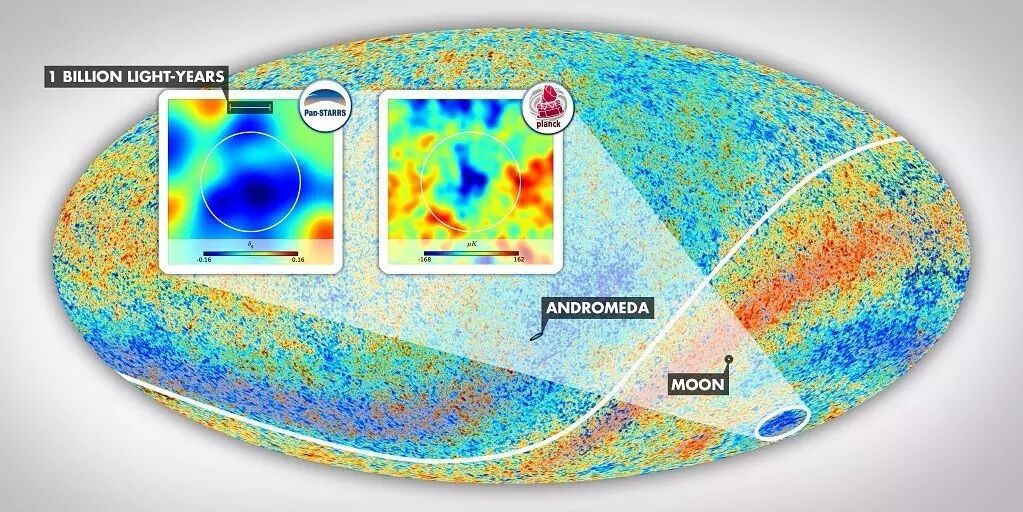 为了解释宇宙微波背景辐射图上的奇异冷斑,一些科学家提出了一个听起来更加奇怪的理论:在这个方向上有一个非常巨大、里面几乎没有任何物质的空洞。