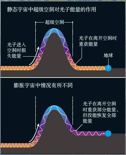 当光穿越超级空洞时,就像球滚过山丘。因为超级空洞内缺乏物质,它的引力吸引作用要比周边高密度区域要小,这就会使得落入的物体像滚上山丘的球一样慢下来。而当这个物体脱离空洞时,就会像滚下山丘的球一样加速前进。光不会减速或者加速,但是它会损失或者获得能量,它的能量与温度直接成正比。