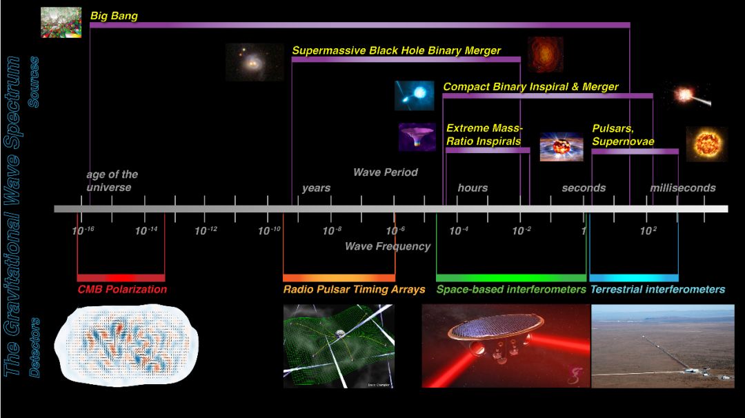 在宇宙中,脉冲星、超新星、双中子星、双黑洞、被超大质量黑洞捕获的致密星、双超大质量黑洞的合并都可以辐射出引力波。不同的探测器只能探测到特定频率范围的现象。上图中我们可以看到四种不同的探测器类型:
