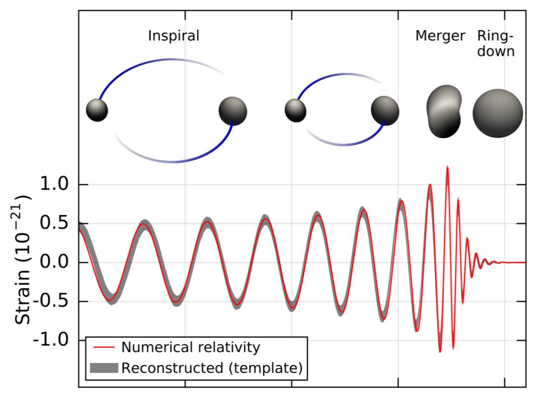 ○ 图中显示了双黑洞经历旋进(inspiral)、合并(merger)和铃宕(ringdown)三个过程的波形。| 图片来源:LIGO