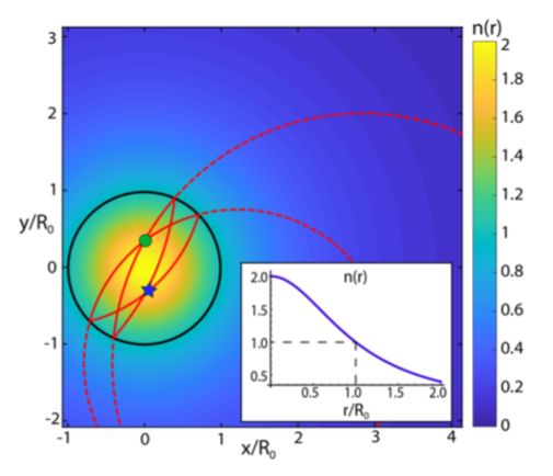 ○  二维麦克斯韦鱼眼透镜(圆形黑线),半径为R0,折射率随着半径的变化n(r)如内嵌图和颜色棒所示。两个原子被置于透镜相对的两端,从透镜中任意一点(绿色圆点)发出的光会在与之相对的点(蓝色星点)处重新汇聚。红色虚线表示半径无限大的鱼眼透镜中的光路。 | 图片来源:J. Perczel et al.