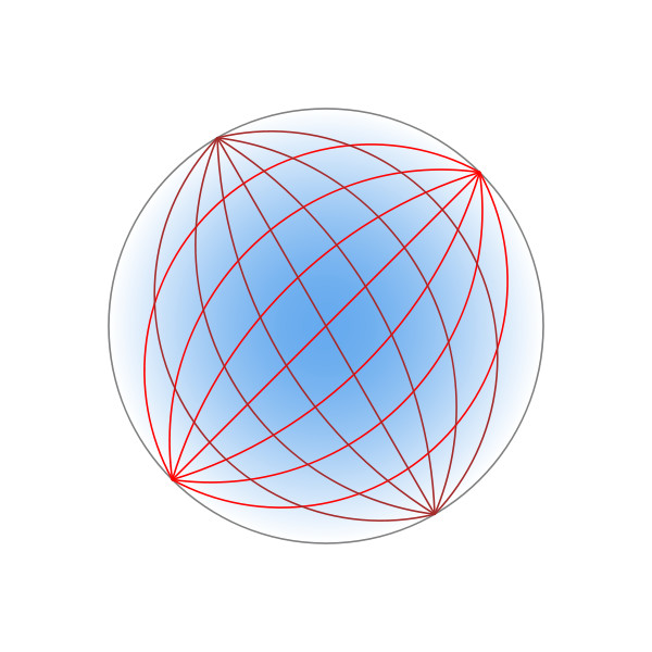 ○  麦克斯韦鱼眼透镜截面示意图。图中颜色深的部分对应更大的折射率。球面上任意一点的光线将汇聚到与之相对的另一点上,光线因而能够沿着完美的圆行进。| 图片来源:Wikipedia