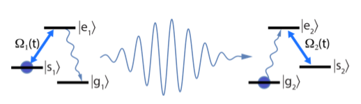 ○  光子在一对原子之间交换的过程示意图。处于激发态的原子(左)发射光子,处于基态的原子吸收光子并处于亚稳态。| 图片来源:J. Perczel et al.