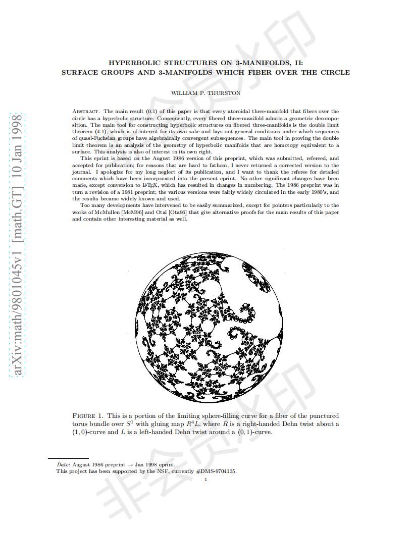 Thurston 证明映射环面上存在双曲结构的论文首页。该项工作把三维流形的双曲结构、Riemann 曲面、分形、填充二维区域的连续曲线等众多领域联系了起来。