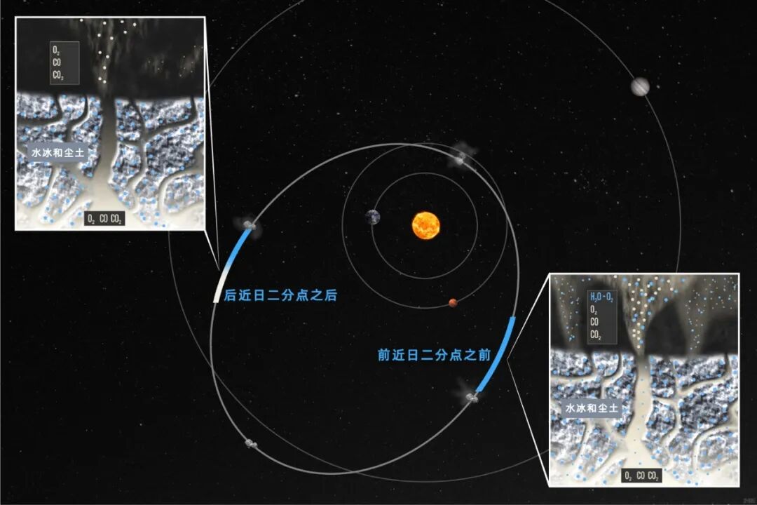 然而,当分子氧从彗星的内部向表面穿越时,一些化学成分会插入水冰,也就是彗星核的主要成分,形成第二个较浅的分子氧储藏库。但是,水冰蒸发的温度要比分子氧高得多,所以在太阳充分加热表面并蒸发水冰之前,分子氧就被卡住了。
