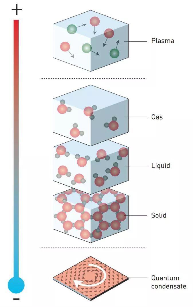 ○  常见的物相有气体、液体和固体(中间三个),在高温下则有等离子体(最上),而在低温状态下,物质会呈现出我们从未见过的相。最下面显示的是量子凝聚。| 图片来源:Johan Jarnestad