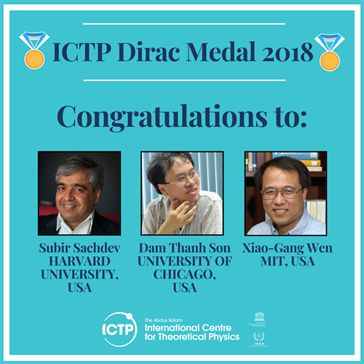 国际理论物理中心(ICTP)将2018年的狄拉克奖授予三位杰出的物理学家——哈佛大学的Subir Sachdev,芝加哥大学的Dam Thanh Son,和麻省理工学院的文小刚——以表彰他们对于理解强关联多体系统中的新物相,以及引入原创的跨学科方法的独立贡献。