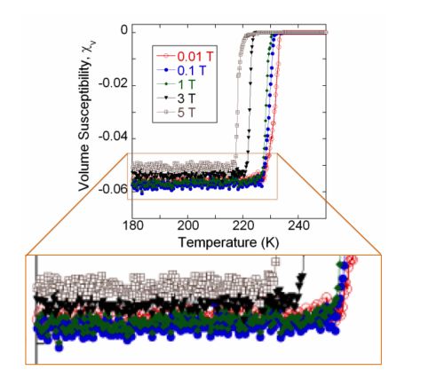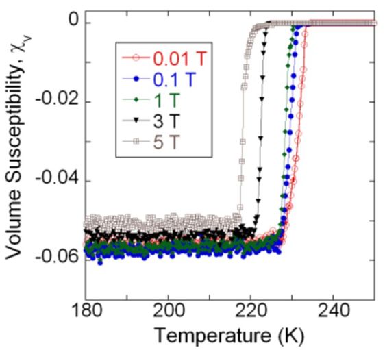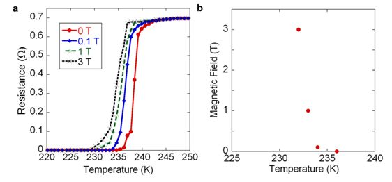 随着温度的降低,电阻刚开始并没有什么显著的变化,但是当温度降低到 230-240K 的区间时,电阻一下子从 0.7 欧降到了 100 毫欧。报告中说由于仪器精度的限制,他们推测实际的测量值可能还要更低。这意味着每单位长度的电阻将小于 0.1 纳欧,比普通金银的电阻整整低两个数量级。Pandey 估计了临界温度在 236K(-37.15°C)附近。临界温度随外磁场的升高而降低,也符合超导体的特性。
