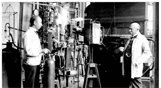 图 | 卡 末 林•昂 内 斯 (右 ) 和 他 的 实 验 员 盖 芮 特灢菲 立 姆 (左 ) 于 1911 年 在 世界上首台氦液化器旁的照片