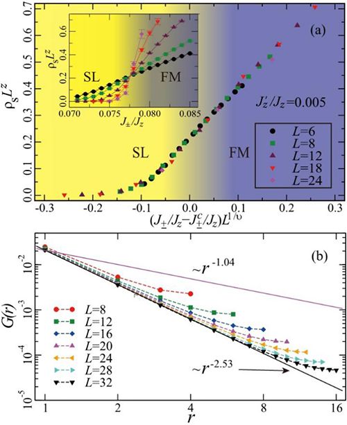 图2 (a)自旋刚度(spin stiffness)在自旋液体(SL)到铁磁序(FM)相变点附近的数据跌落,其中,临界指数 υ 是三维XY 普适类的临界指数。(b)等时自旋-自旋关联函数G(r)=⟨S+0S−r⟩ 随距离 r 的变化关系。可以看到,在双对数坐标下,G(r)∼r−(1+η),其中反常维度 η=1.53(4),远大于普通的三维 XY 的反常维度0.04。因此该相变属于一类特殊的三维 XY∗ 普适类。