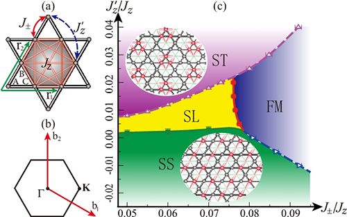 图1 (a)Kagome晶格以及不同格点间的自旋相互作用;(b)Kagome晶格的倒格矢及其第一布里渊区;(c)扩展BFG模型在1/6 平均磁矩下的相图:ST(staggered solid):交错固体相,SS(stripped solid):条纹固体相, FM (ferromagnet): 铁磁相 , SL(quantum spin liquid):量子自旋液体相。