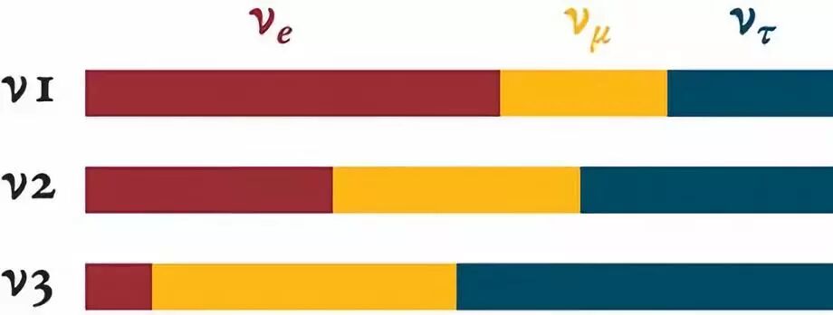 中微子的三个质量特征态ν1,ν2,ν3和三个“味”特征态νe,νμ,ντ混合。每个质量特征态都是由不同比例的三味特征态组成。