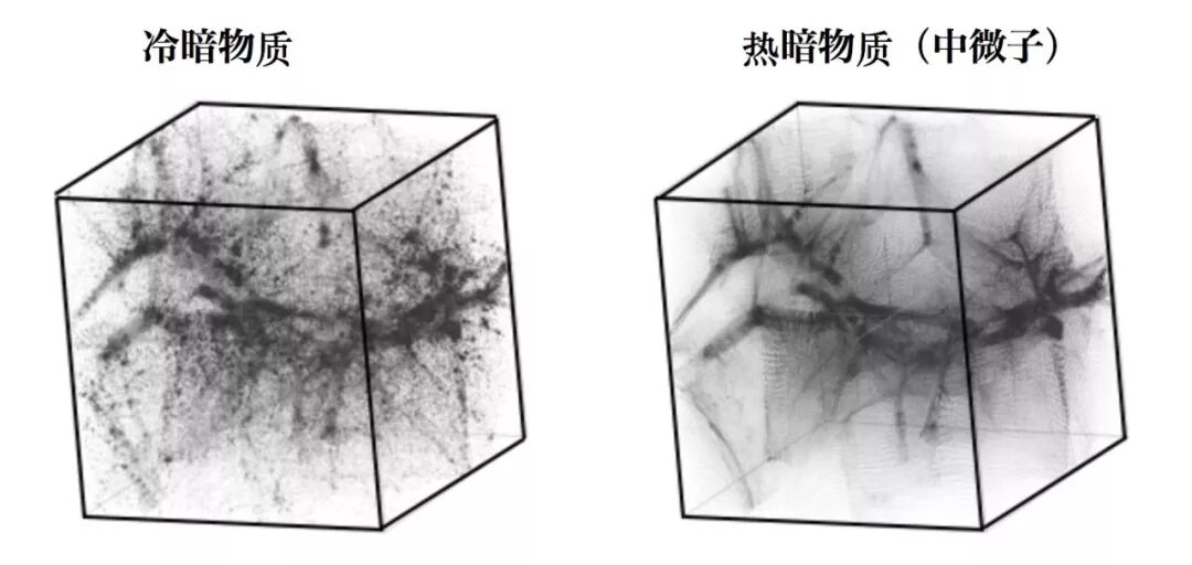 冷暗物质和热暗物质(宇宙中微子)对宇宙结构形成的影响。该图为宇宙模拟数据,灰色深浅表示密度大小。冷暗物质更容易受引力影响,相互聚集并形成星系和星系团(颜色最深的地带,左图)。中微子因为极轻的质量和极高的动能,不容易相互聚集。如果宇宙中有过多的中微子,星系和星系团的数量会因此减少(右图)。(图源:Katrin Heitmann)