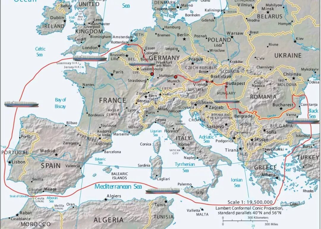 主能谱仪的制造地代根多夫到卡尔斯鲁厄实验室的运输路线(红线)。虽然它们的直线距离不过400公里,因为无法从道路运输,只能走水运,结果绕了9000公里的路,花了8个月才到达。(图源:The University of Texas at Austin)