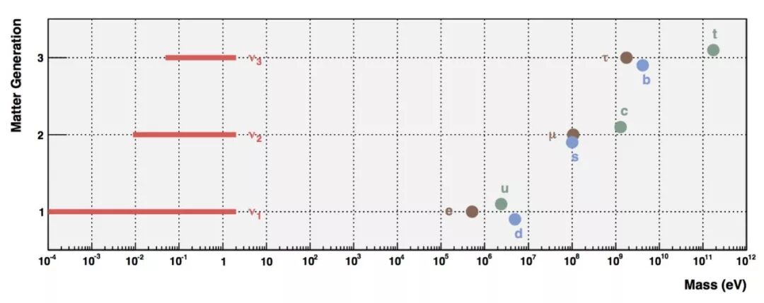 费米子质量排列图。红色为中微子,它们的质量远低于其他的费米子。(图源:Gomez-Cadenas et al (2011))