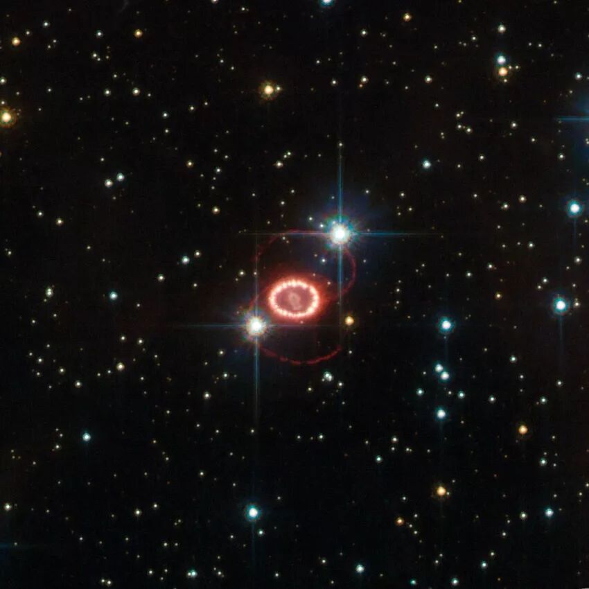 大麦哲伦星系的超新星爆炸1987A发射出1058个中微子。其中仅有25个在地球上被探测到,包括日本神冈探测器的12个(2002年诺贝尔物理奖),美国厄文-密歇根-布鲁克海汶(IMB)探测器的8个,俄罗斯巴克三(Baksan)探测器的5个。(图源:ESA/Hubble & NASA)