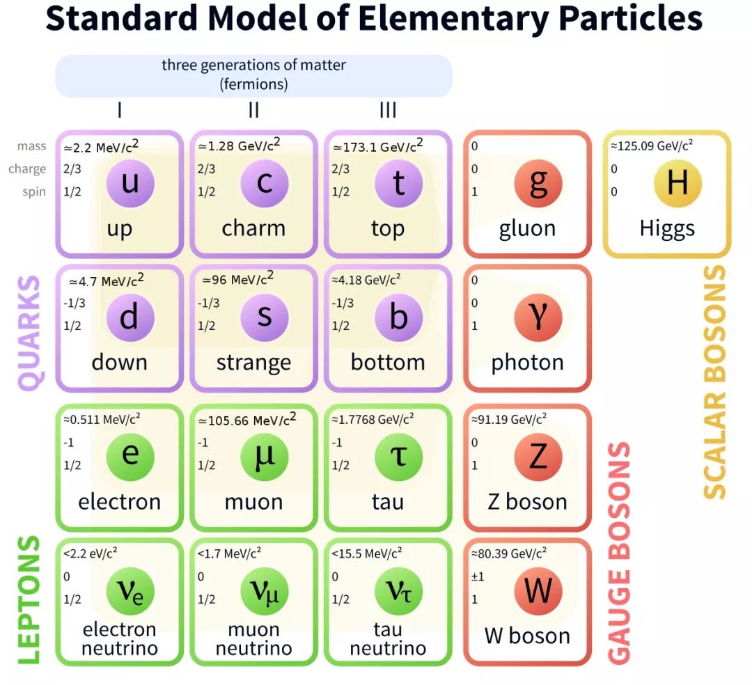 粒子物理标准模型包括17个基本粒子,是目前对物理世界的最精确描述。其中三个中微子νe,νμ,ντ(底排绿色)的质量未知,目前只能确定质量下限和上限。(图源:维基百科)