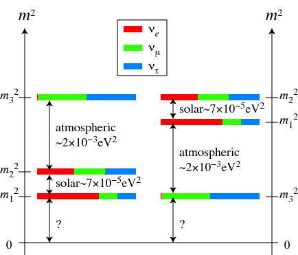 太阳中微子振荡数据确定了m12-m22,大气中微子振荡数据确定了|m32-m22|,我们可以由此推导出三个中微子的总重量必须大于0.06 eV。然而,因为我们只知道m32-m22的绝对差,而不知道其符号是正是负,因而有两种方法来给三个质量排序——正排序(Normal Hierarchy,左)和逆排序(Inverted Hierarchy,右)。(图源:Stephen F. King)