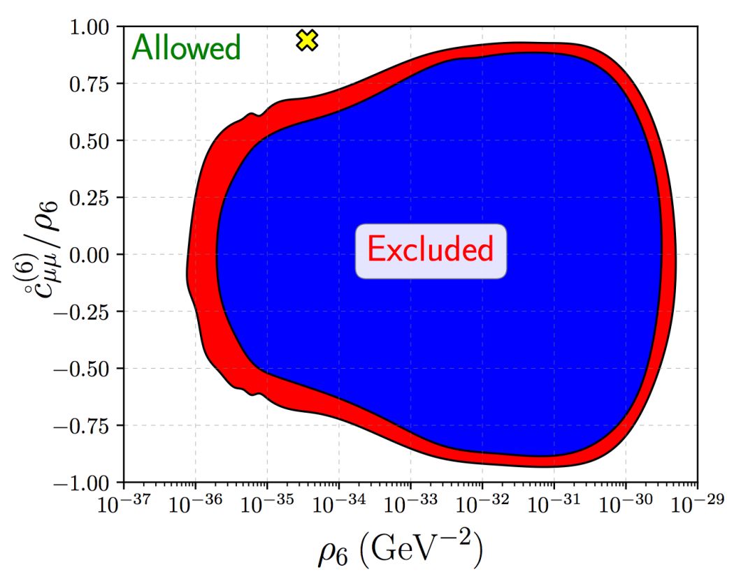 ○ 横轴(ρ₆)代表了洛伦兹破缺的强度。图中白色区域是洛伦兹破缺被允许的区域;最佳的拟合点用黄色叉表示;蓝色和红色区域是被排除的区域。| 图片来源:IceCube Collaboration