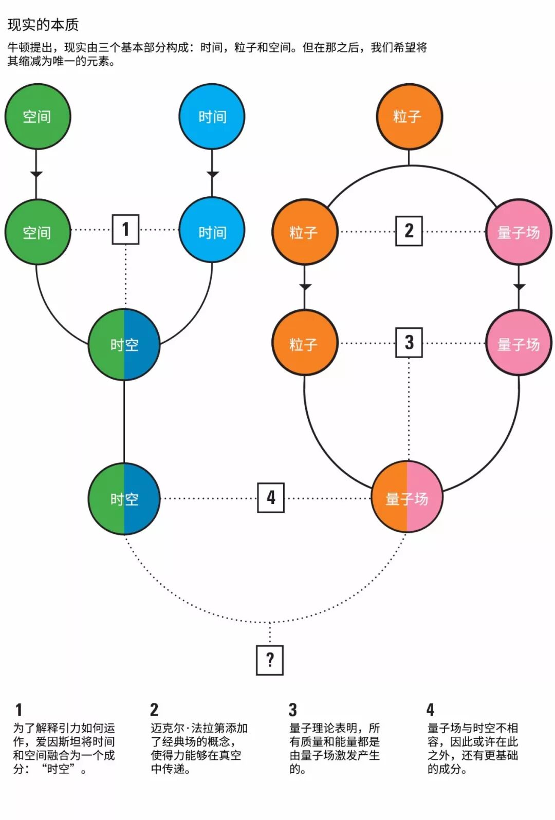 但即使没有这个限制,牛顿的体系也不能解释一切。尽管它描述了万有引力(使得有质量物体在宇宙中运动的吸引力),但却不能解释这种力的本质。除此之外,宇宙之中的其他力也同样神秘,例如电磁力。一直以来,我们对现实本质成分的讨论从未停止(见下图)。
