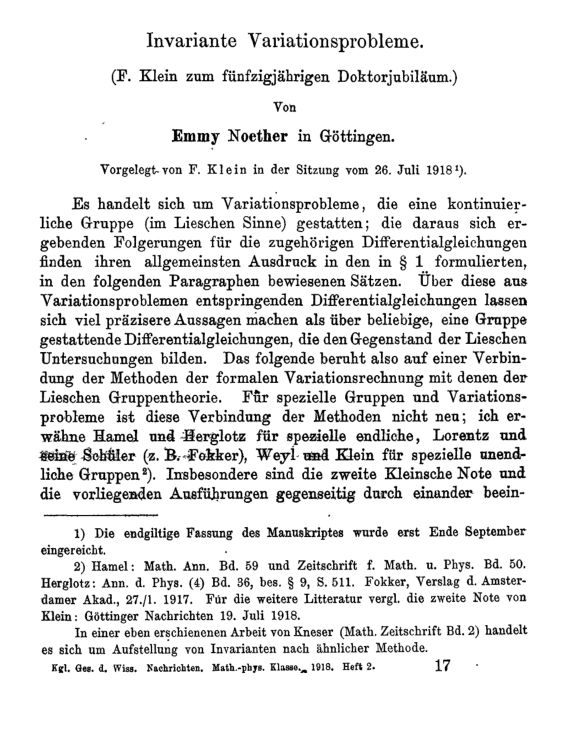 在她证明第二个定理的过程中,诺特证明了她的第一个定理是关于对称性和守恒定律之间的联系。1918年7月26日,这两个结果被发表在 Göttinger Nachrichten 上。