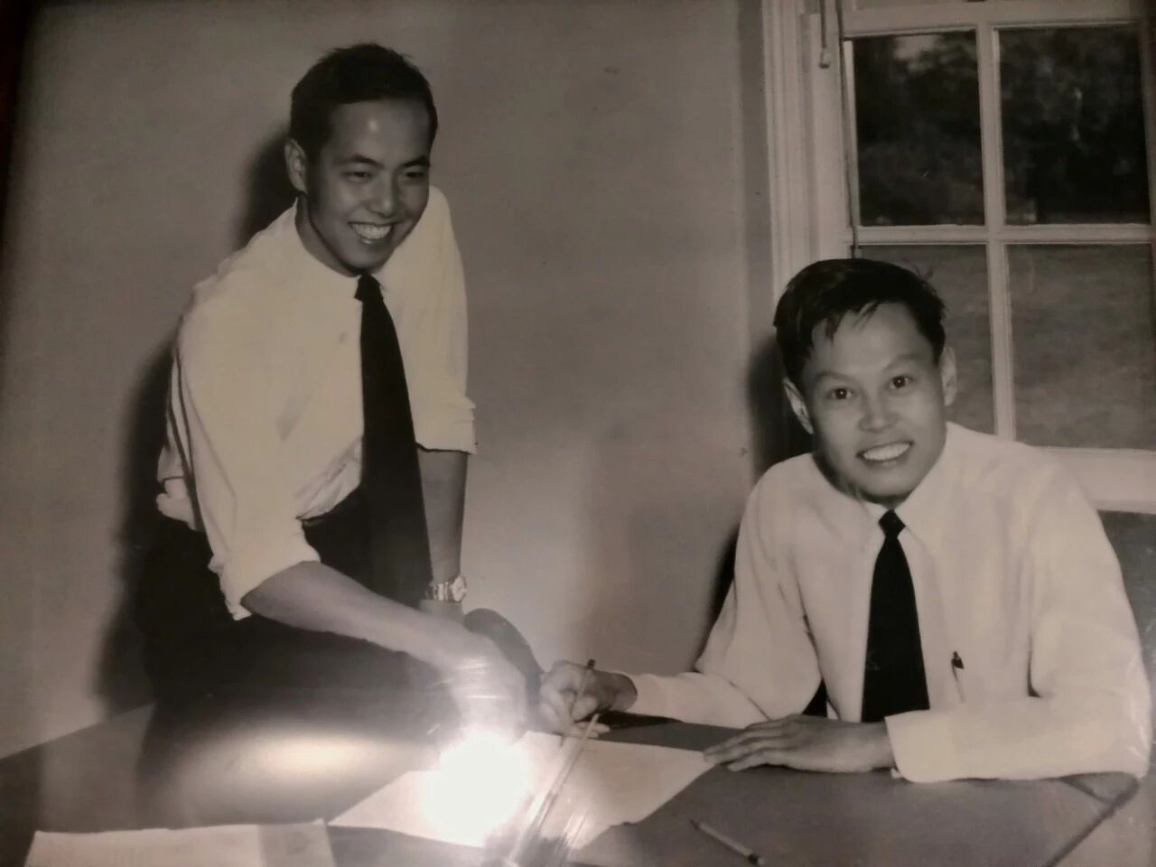 李政道(左)和杨振宁(右)合影。两人于1956年共同提出宇称不守恒理论,并因此共同获得1957年诺贝尔物理学奖。图片来源:美国物理学会赠与果壳的照片